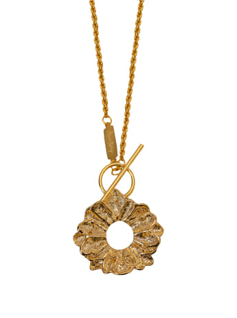 - Chain made by hand in bronze with 24 karat gold plating, featuring a casting piece with bolero texture and Swarovski inlay