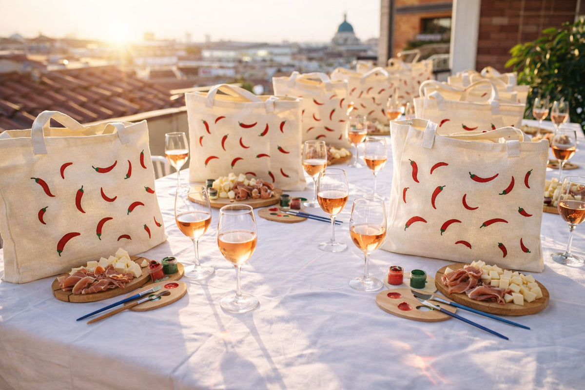 The tote bag painting theme is inspired by the Calabrian chili pepper, a playful icon of Italian culture. We'll provide inspiration and guidance, while still leaving plenty of room for each guest to make her design her own.
